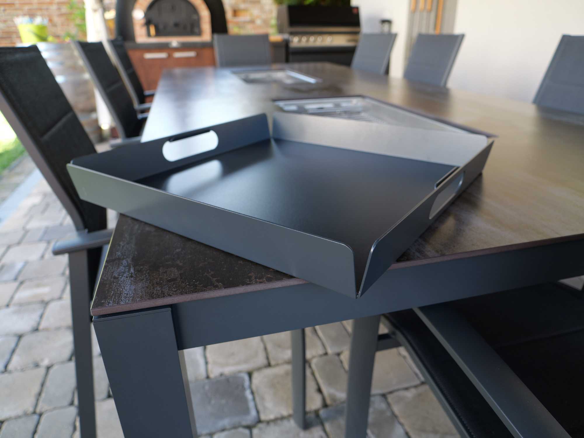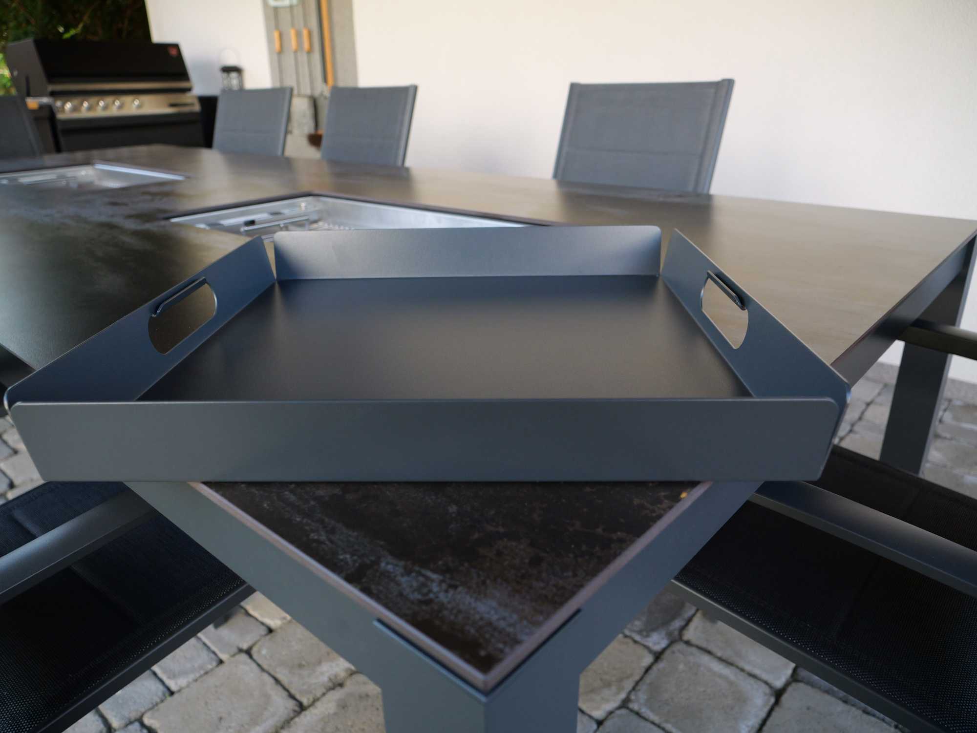 Kiváló minőségű, porfestett alumínium tálaló. Ezt a tálcát úgy terveztük, hogy kényelmes legyen a fogása és ne sértse meg a kezed, amikor megpakolod. A kiemelkedő széleknek köszönhetően kényelmesen magadhoz támaszthatod és könnyebben szállíthatod rajta a szükséges dolgokat. Nedves ruhával egyszerűen tisztítható.